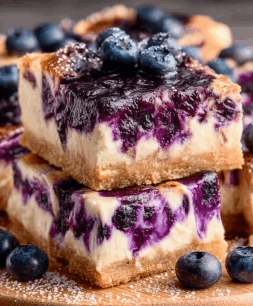 Delicious, creamy blueberry swirl cheesecake bars with a buttery graham cracker crust. Perfect for sharing or a special treat!