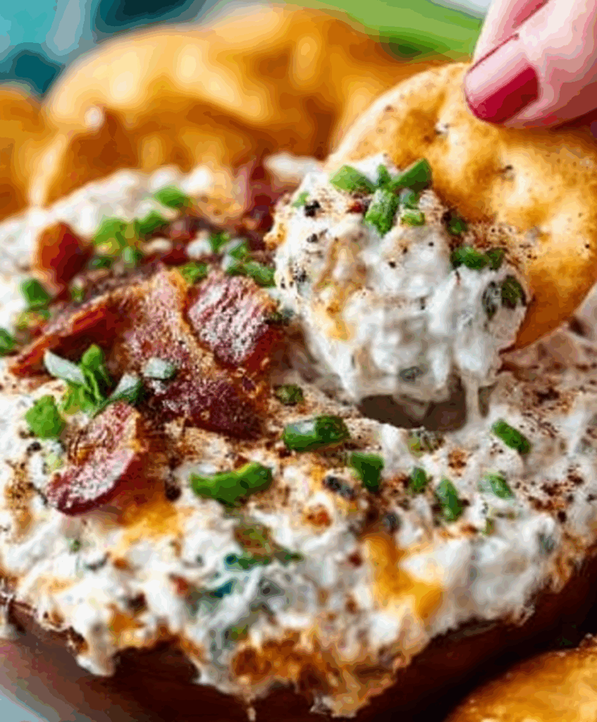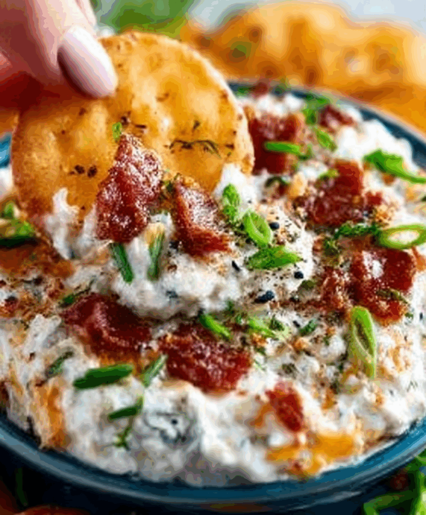 - Sprinkle the reserved crumbled bacon and a few extra chopped green onions on top for garnish. This makes the dip look extra appealing!