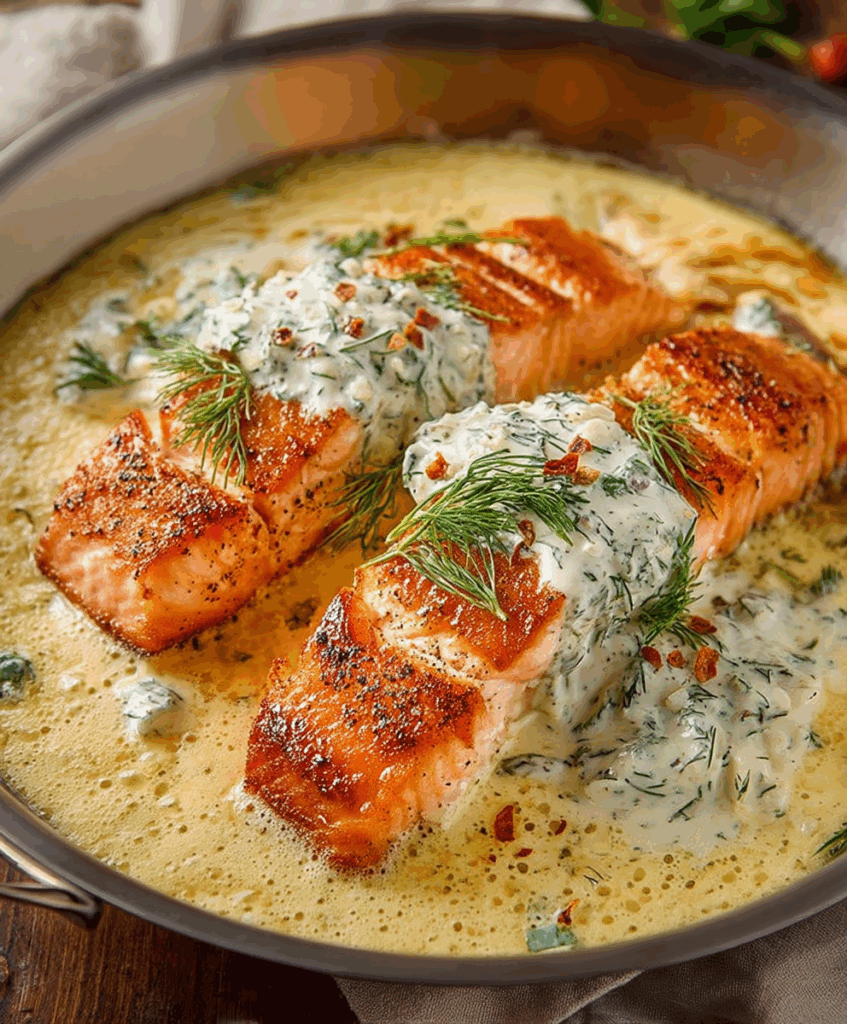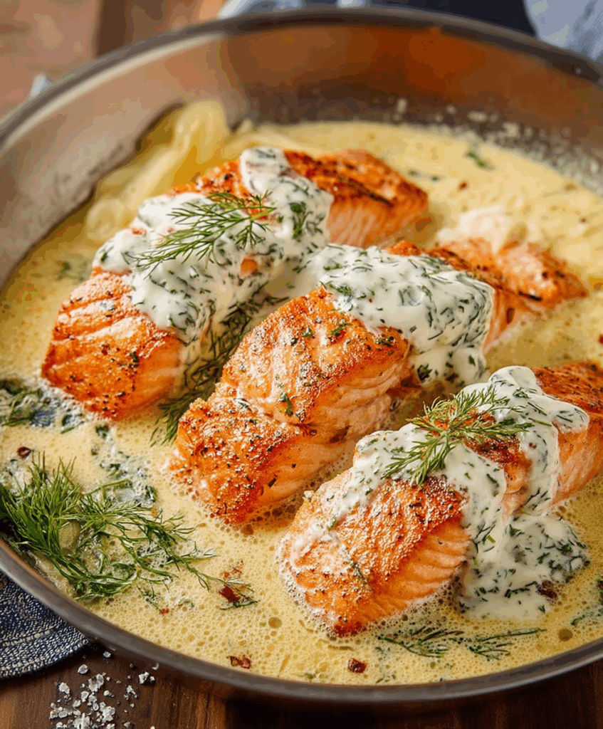Flaky salmon fillets seared to perfection and smothered in a luscious, creamy dill sauce. A restaurant-quality meal made easy at home!