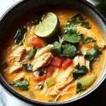 This Thai Chicken Curry Soup isn’t just another recipe; it’s a passport to a vibrant, flavorful experience. The aromatic blend of ginger, garlic, and lemongrass dances with the creamy coconut milk and the subtle heat of red curry paste, creating a symphony of tastes that will tantalize your taste buds. It’s a comforting hug in a bowl, perfect for a chilly evening or whenever you crave a taste of Thailand. I truly believe this recipe is a must-try because it’s surprisingly easy to make, even for beginner cooks, and the results are restaurant-quality delicious. But the best part? It’s incredibly versatile! Feel free to adjust the spice level to your liking by adding more or less red curry paste. For a vegetarian option, simply substitute the chicken with tofu or your favorite vegetables like broccoli, bell peppers, or mushrooms. You could even add some shrimp or scallops for a seafood twist. Serving Suggestions: * Serve this delightful soup hot, garnished with fresh cilantro and a squeeze of lime juice for an extra burst of freshness. * A dollop of sour cream or Greek yogurt can add a lovely tang and creaminess. * For a heartier meal, serve it over a bed of fluffy jasmine rice or rice noodles. * Crispy fried wonton strips or toasted coconut flakes make a fantastic crunchy topping. * A side of warm naan bread or roti is perfect for soaking up all that delicious broth. Variations to Explore: * Spice it up: Add a finely chopped Thai chili or a dash of chili oil for an extra kick. * Make it sweeter: A touch of brown sugar or honey can balance the flavors beautifully. * Add more veggies: Spinach, bok choy, or even green beans would be wonderful additions. * Go nutty: A sprinkle of chopped peanuts or cashews adds a delightful crunch and nutty flavor. * Coconut Cream Boost: For an even richer and creamier soup, substitute some of the coconut milk with coconut cream. I’ve poured my heart into perfecting this recipe, and I’m confident that you’ll love it as much as I do. It’s a guaranteed crowd-pleaser, perfect for weeknight dinners or special occasions. The beauty of this Thai Chicken Curry Soup lies in its adaptability; you can easily customize it to suit your preferences and dietary needs. So, what are you waiting for? Gather your ingredients, put on some music, and get ready to embark on a culinary adventure. I’m so excited for you to try this recipe and experience the magic of Thai flavors in your own kitchen. Once you’ve made it, I’d absolutely love to hear about your experience! Share your photos and comments on social media using [Your Hashtag] or leave a review on the blog. Let me know what variations you tried and how you made it your own. Your feedback is invaluable and helps me continue to create recipes that you’ll love. Happy cooking! Print