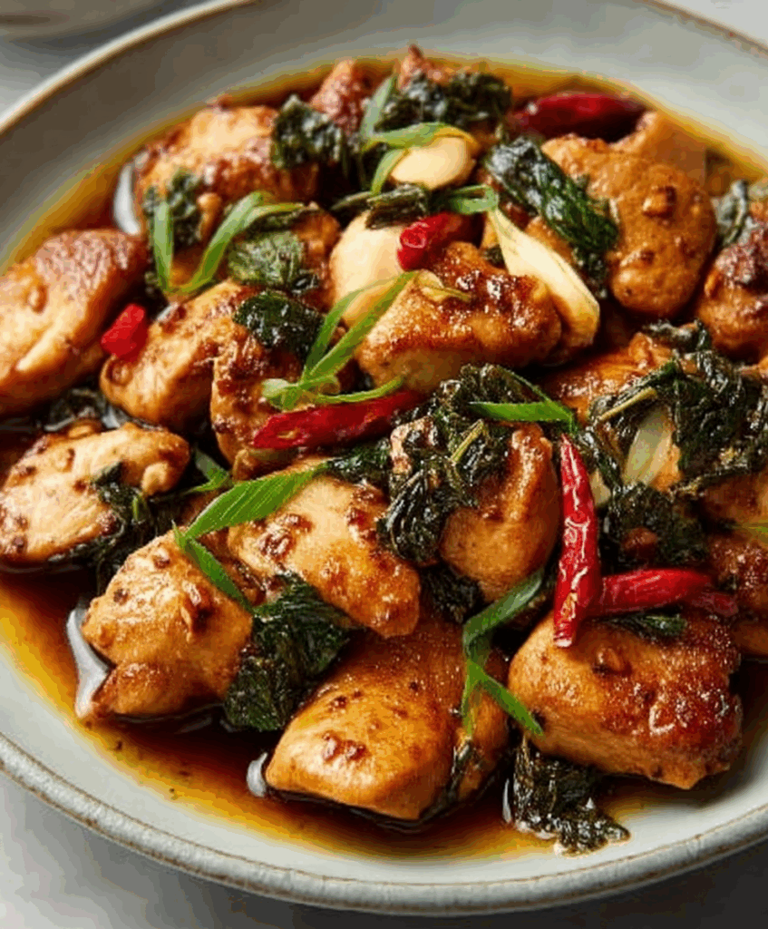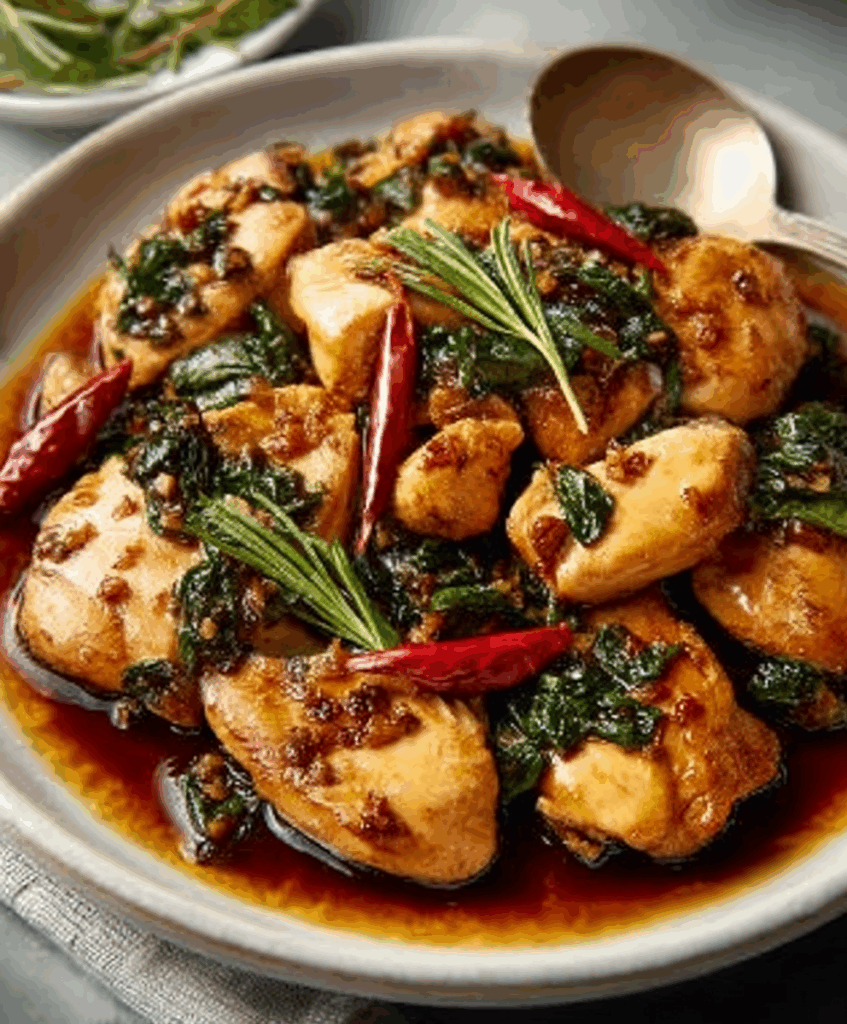 Savory and flavorful Three Cup Chicken with tender chicken thighs simmered in a rich sauce of soy sauce, rice wine, and sesame oil, infused with garlic, ginger, and Thai basil.